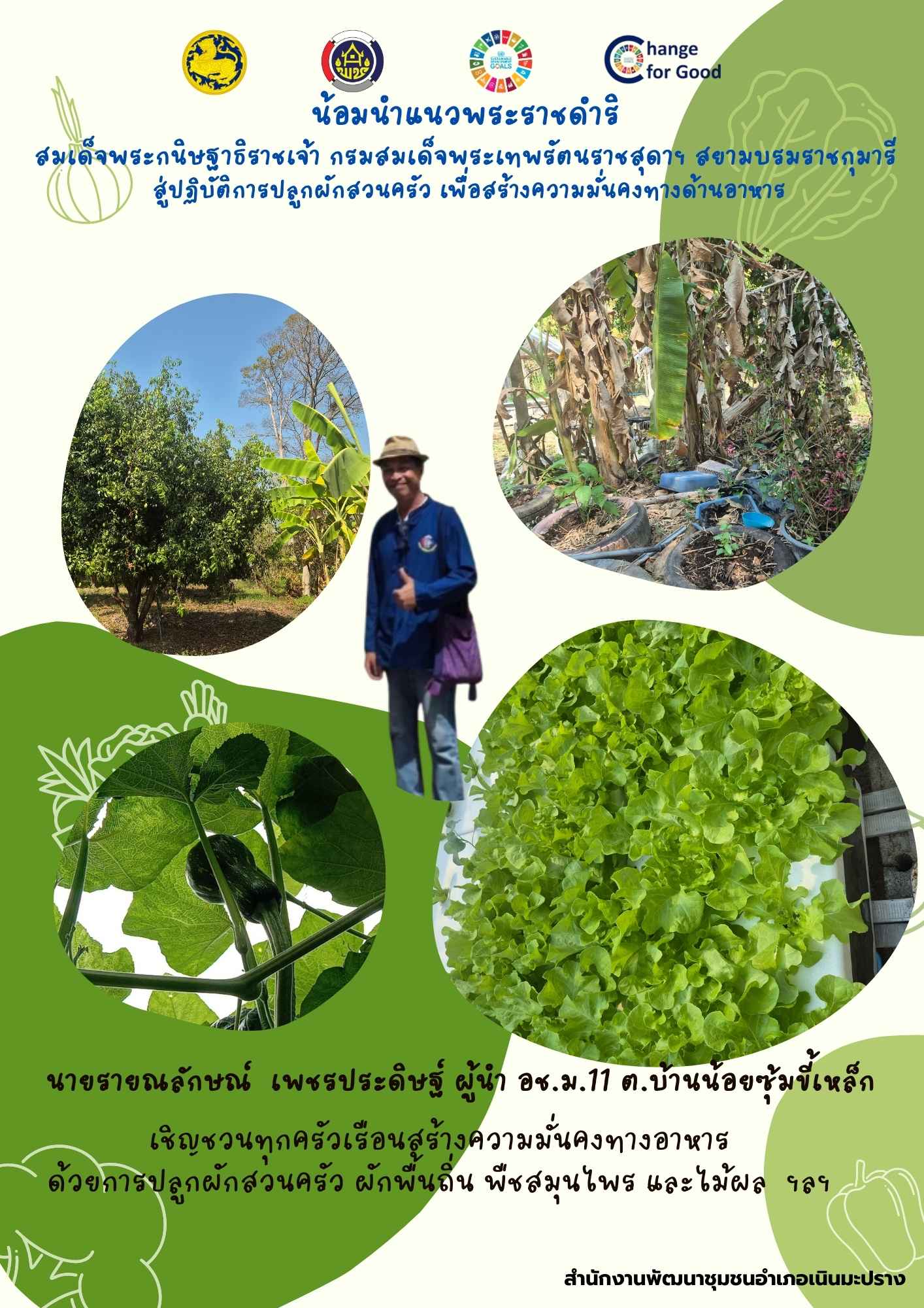 สำนักงานพัฒนาชุมชนอำเภอเนินมะปราง น้อมนำแนวพระราชดำริของสมเด็จพระกนิษฐาธิราชเจ้า กรมสมเด็จพระเทพรัตนราชสุดาฯ สยามบรมราชกุมารี สู่ปฏิบัติการปลูกผักสวนครัว เพื่อสร้างความมั่นคงทางด้านอาหาร ประจำปีงบประมาณ พ.ศ.2569 ภายใต้กิจกรรม "ครัวเรือนต้นแบบ" ขยายผลสู่การปฏิบัติในระดับครัวเรือน ให้ครัวเรือนปลูกพืชผักสวนครัว ผักพื้นถิ่น พืชสมุนไพร และไม้ผล โดยเน้นการปลูกพืชหลากหลายชนิดที่นำมาบริโภคภายในครัวเรือน ครัวเรือนต้นแบบ นายรายณลักษณ์ เพชรประดิษฐ์ ผู้นำ อช. ม.11 ต.บ้านน้อยซุ้มขี้เหล็ก อ.เนินมะปราง จ.พิษณุโลก